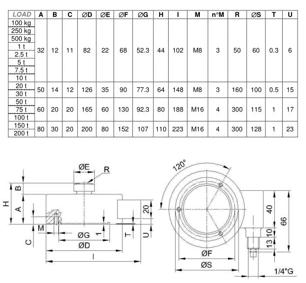 MECHANICAL LIMIT values referred to nominal load: a) minimum load b) service load c) max permissible load d) breaking load e) max transverse load f) max permissible dynamic load DISPLACEMENT AT NOMINAL LOAD |