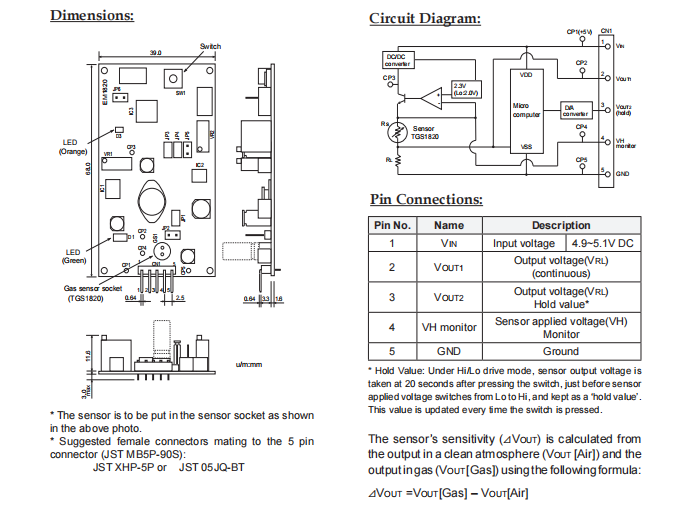 This module facilitates evaluation of the characteristics of the acetone gas sensor TGS1820.*1The sensor sensitivity (⊿VOUT) is obtained by calculating the difference between the voltage output in a clean atmosphere and the voltage output in gas. *2