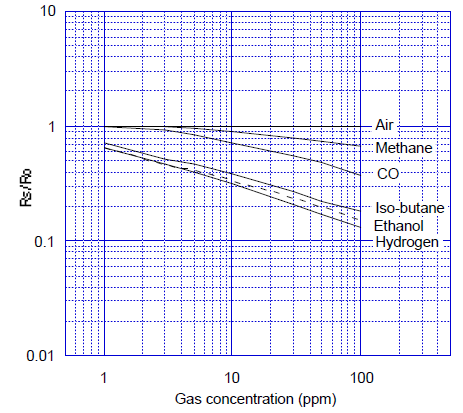 The figure below represents typical sensitivity characteristics, all data having been gathered at standard test conditions (see reverse side of this sheet). The Y-axis is indicated as sensor resistance ratio (Rs/Ro) which is defined as follows:
