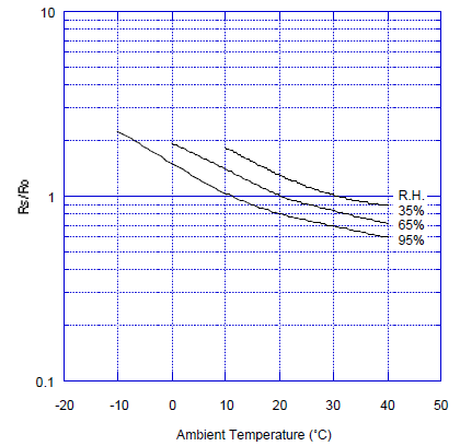 The figure below represents typical temperature and humidity dependency characteristics. Again, the Y-axis is indicated as sensor resistance ratio (Rs/Ro), defined as follows:
