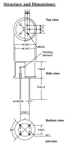 The TGS2600 has high sensitivity to low concentrations of gaseous air contaminants such as hydrogen and carbon monoxide which exist in cigarettesmoke. The sensor can detect hydrogen at a level of several ppm.Due to miniaturization of the sensing chip, TGS 2600 requires a heater current of only 42mA and the device is housed in a standard TO-5 package.