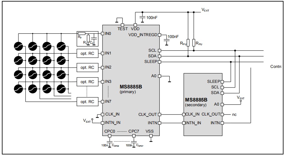 Changes in the static capacitances (as opposed to dynamic capacitance changes) are automatically compensated using continuous auto-calibration. Remote sensing plates (e.g.conductive foil) can be connected to the IC using coaxial cable.