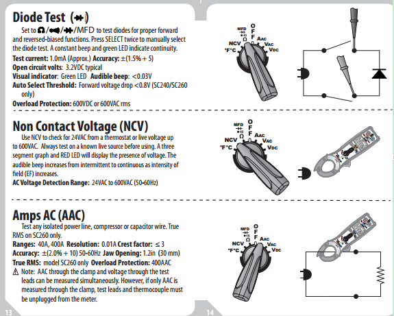 The SC240 Compact Clamp Meter with Temperature packs a big punch in a compact meter. With features that rival many full-sized clamp meters, this auto ranging digital multimeter packs a ton of functions into a compact, easy to handle shape. It includes temperature in both Fahrenheit and Celsius, capacitance as well as non-contact voltage indicators. It also packs in most of the other HVACR ranges you use everyday. Some technicians use the SC240 as their everyday DMM, others as a back-up or second meter to get more testing done in less time. This compact HVACR clamp meter was deigned to make your job easier, safer, and faster no matter where you choose to rank it in your bag.