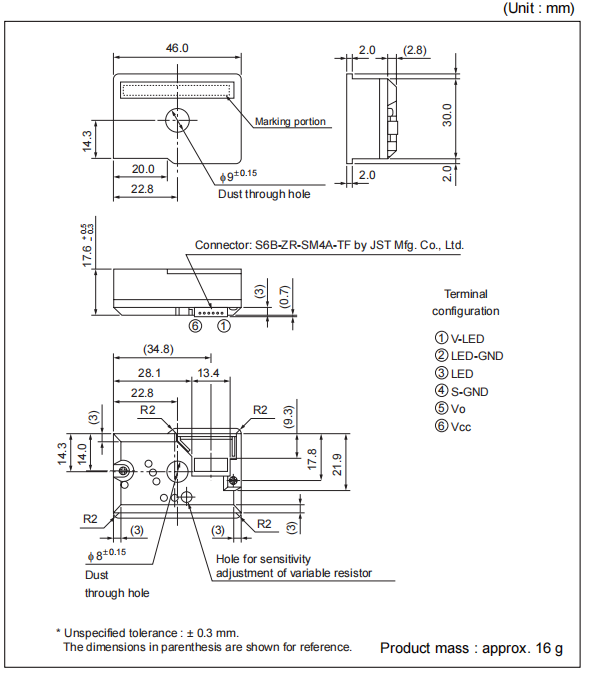 GP2Y1010AU0F Compact Optical Dust Sensor Outline Dimensions: