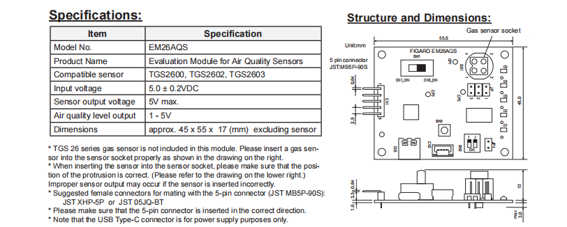Accommodates three models of TGS26 series air quality sensors(TGS2600, TGS2602, TGS2603)