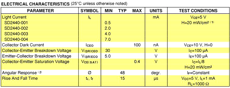 The SD2440 is an NPN silicon phototransistor mounted in a hermetically sealed glass lensed metal can package. This package directly mounts in a double sided PC board.