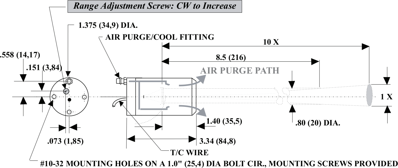 3. If the target temperature is not known, measure the target temperature with an accurate reference. Remove the setscrew to expose the calibration screw. Adjust the calibration screw to obtain reading desired. Replace the setscrew cover when complete. For final process adjustments, the ZERO or OFFSET adjustments available on readout devices can be conveniently used.