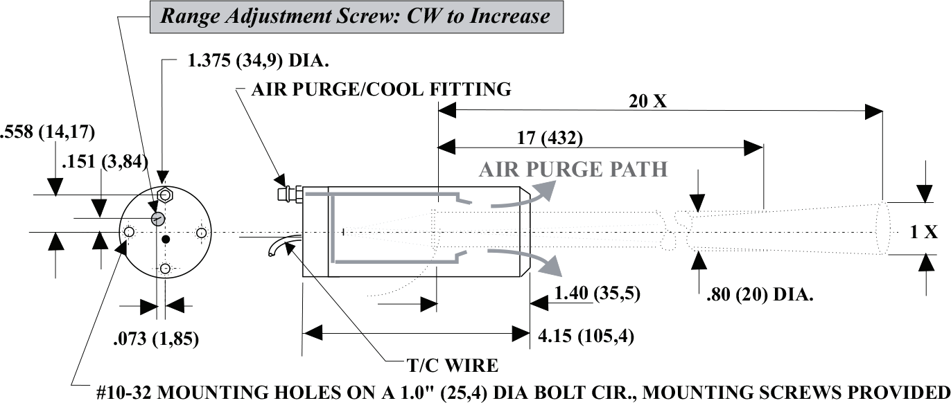 3. If the target temperature is not known, measure the target temperature with an accurate reference. Remove the setscrew to expose the calibration screw. Adjust the calibration screw to obtain reading desired. Replace the setscrew cover when complete. For final process adjustments, the ZERO or OFFSET adjustments available on readout devices can be conveniently used.