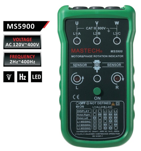Motor and Phase Rotation Indicator is a handheld, battery-operated instrument designed to detect the rotary field of three-phase systems and determine motor-rotation direction.