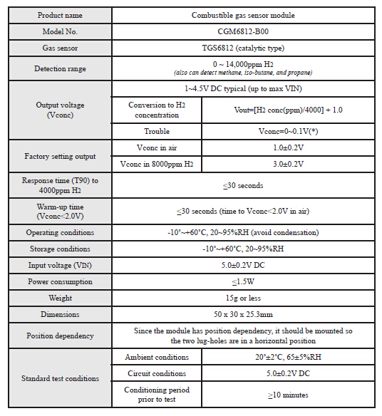The CGM6812-B00 combustible gas sensor module is a new unit which utilizes TGS6812, Figaro's catalytic pellistor type gas sensor which features durability and stability. This module provides analog output voltage proportional to hydrogen gas concentration. CGM6812-B00 has conformal coatings for moisture-proofing and electrical insulation purposes, and is also capable of detecting sensor wire breakage. The unit has a wide range of operating temperature from -10? to +60?C.