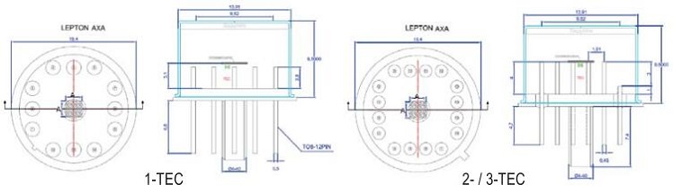 TO-8 hermetic packaging: 15.24 mm (0.600") diameter, 12 connections (1-TEC, only 6 in use) / 16 connections (2- / 3-TEC, only 6 in use), separation between leads 10.16 mm (0.400"), cap with sapphire window (AR)