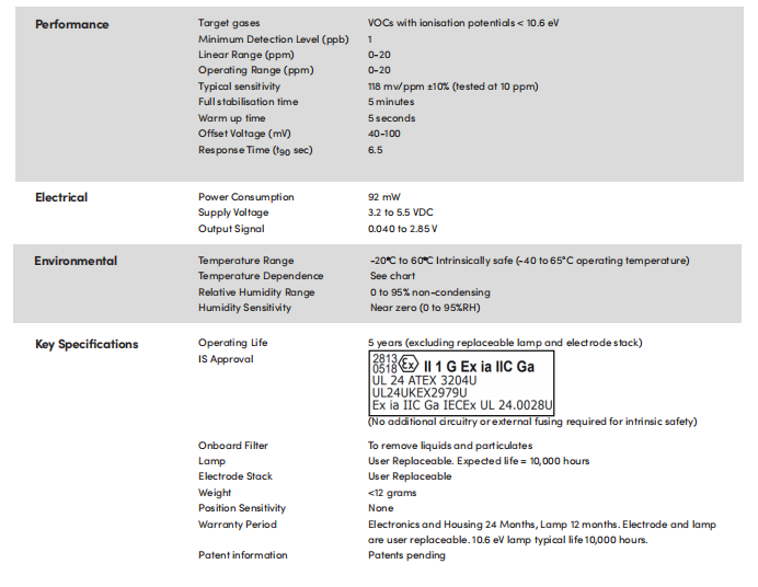 PIDX series sensors are developed for professional, demanding applications. It achieves a tenfold improvement in repeatability between sensors, consistent temperature response, baseline stability over a wide humidity range, and low power consumption and operating voltage. In addition to the intrinsic safety level, the PIDX series features onboard fault detection to ensure that a fault reading is issued when an error is detected, preventing the user from being in an unsafe state. Faster integration, no workarounds and an accurate, easy-to-use sensor for all applications on the market. With ATEX, UKEX, UL24, xRUus rated for use in hazardous locations, the PIDX series is a great choice for professional, demanding applications that require superior accuracy, repeatability between sensors, and advanced features such as on-board fault detection.